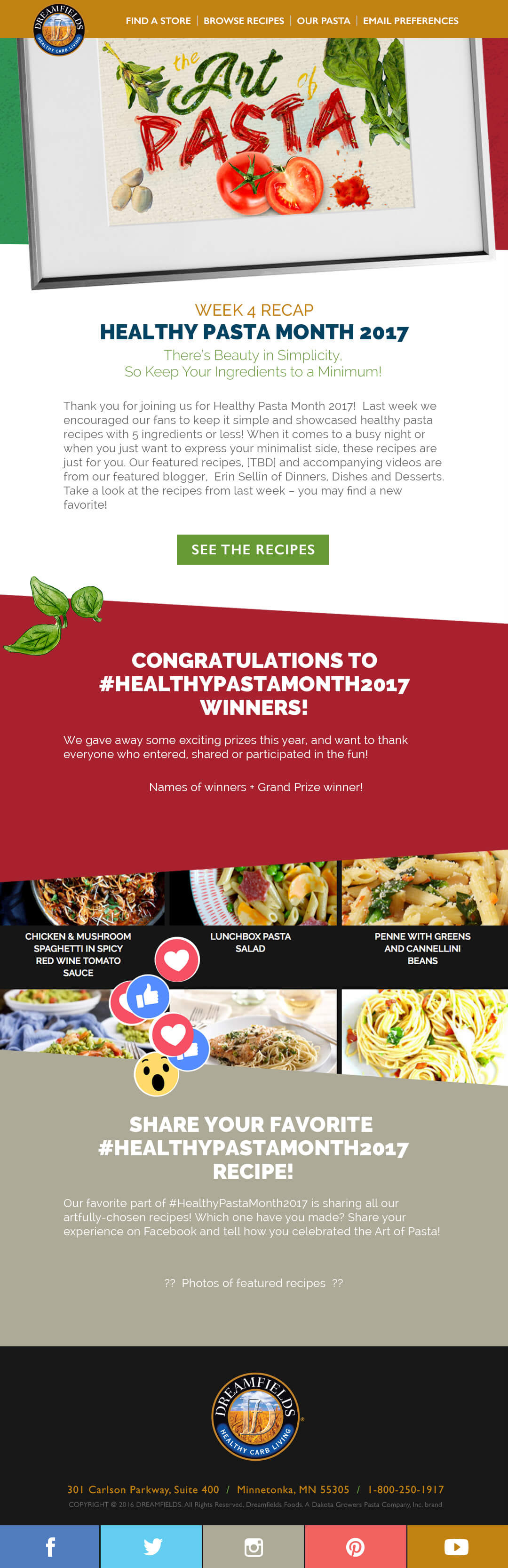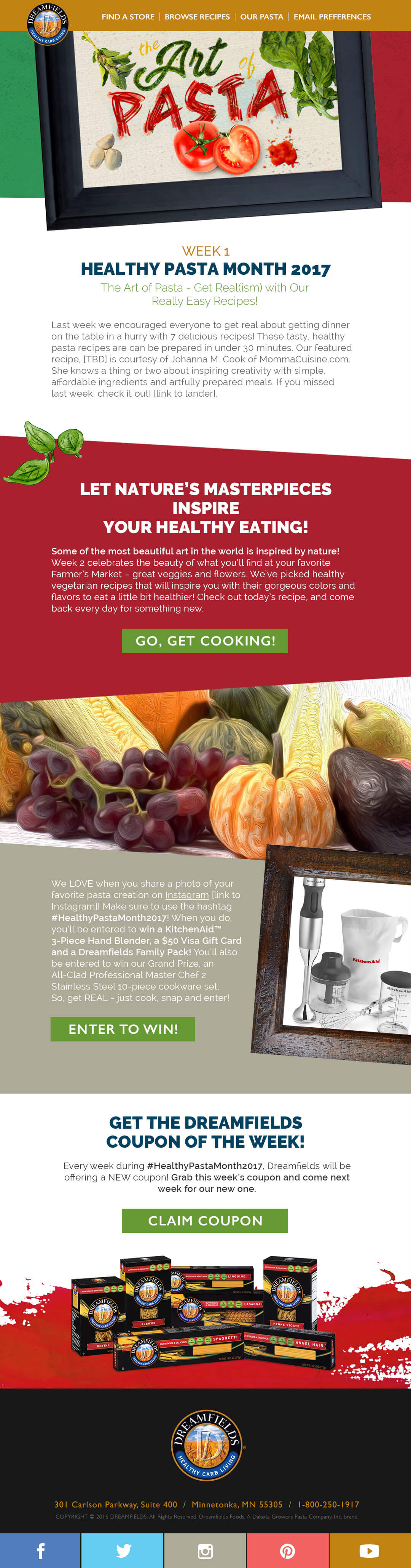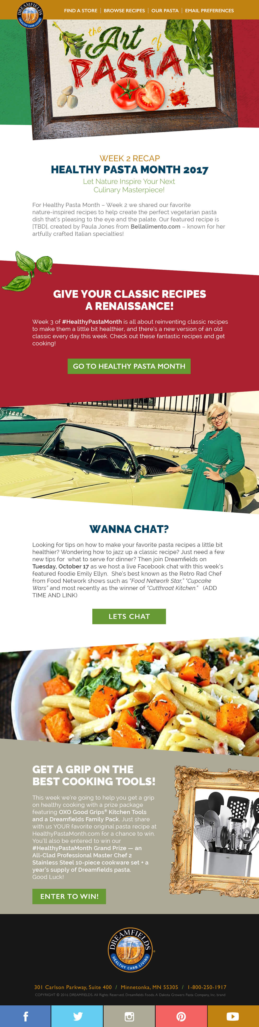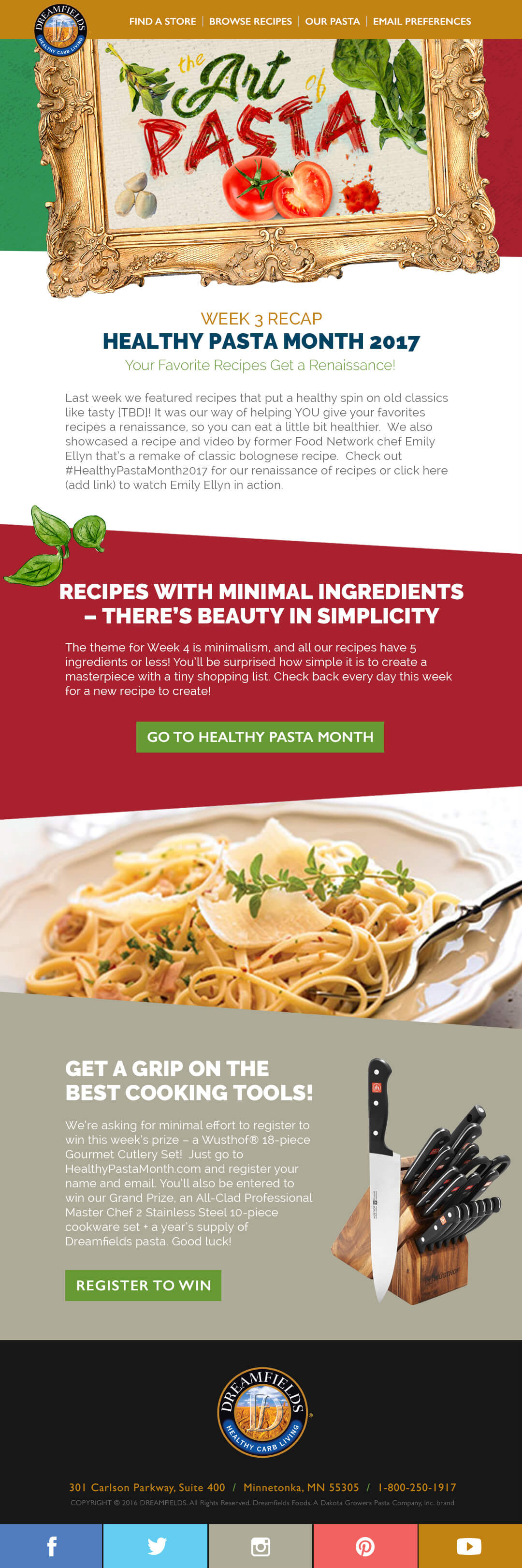 Pasta is the canvas upon which many a culinary masterpiece has been created. For #HPM17 we propose maximizing that artistic umbrella theme through weekly themes, the look of the landing page, and the prizes awarded.