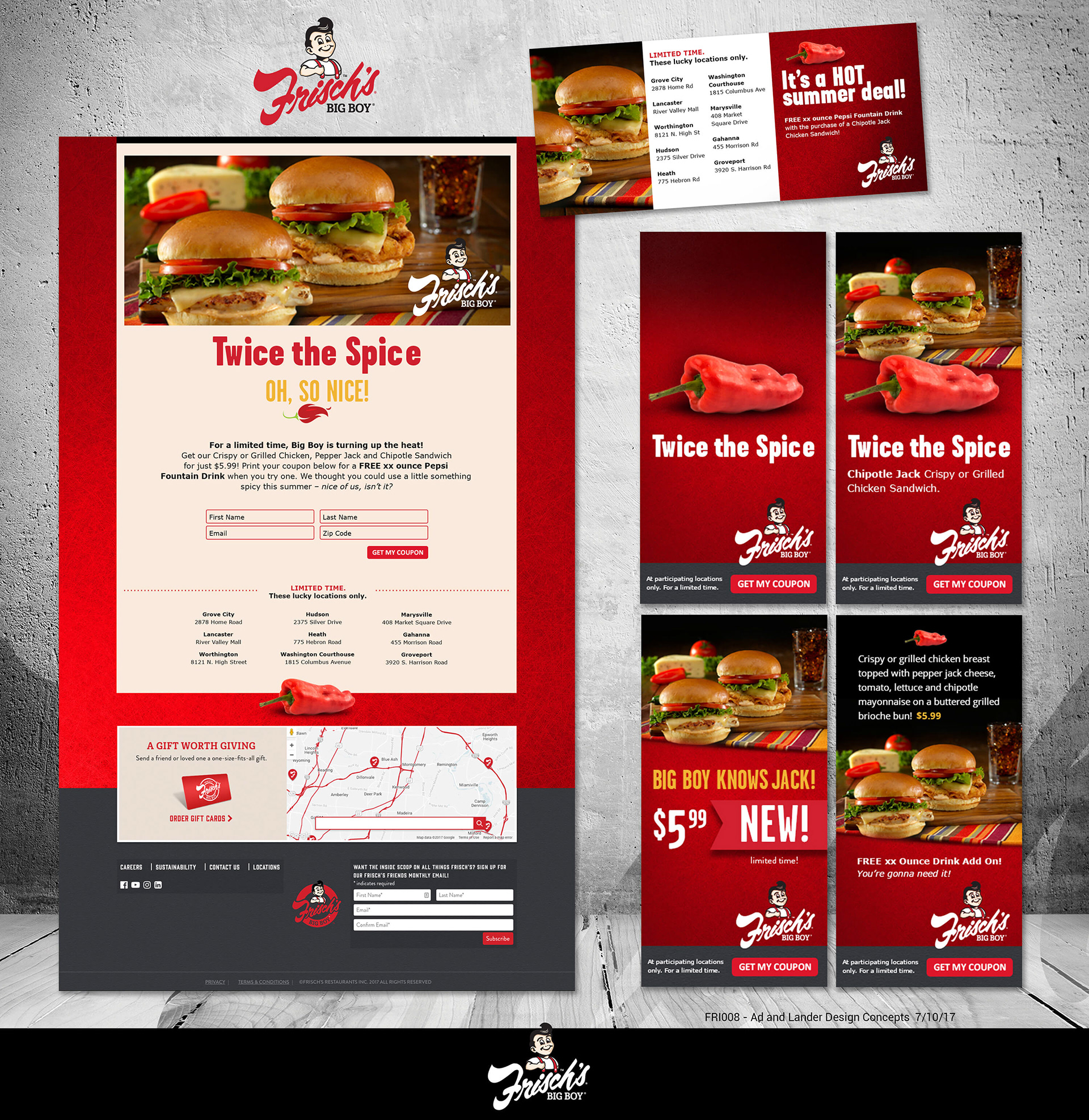 Concepts and design for Frisch's landing page, animated display advertising and triggered email with digital coupon to support their new Chipotle Chicken sandwich promotions.