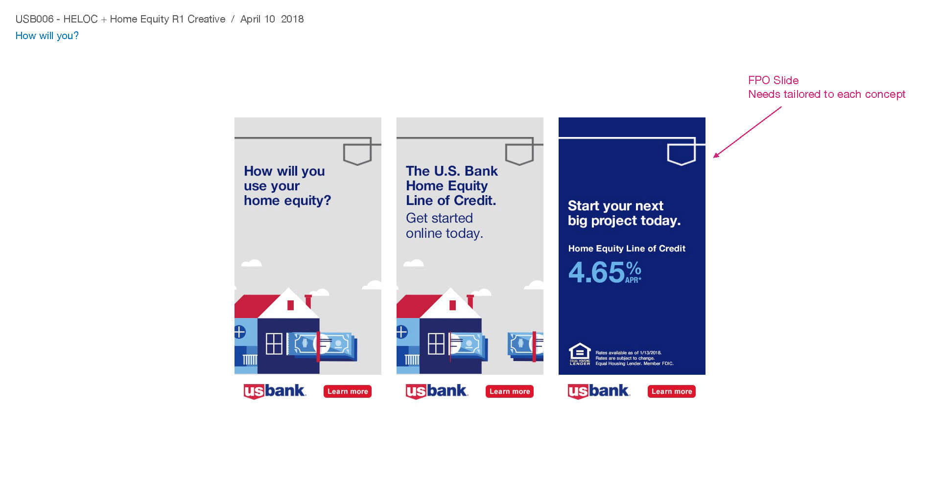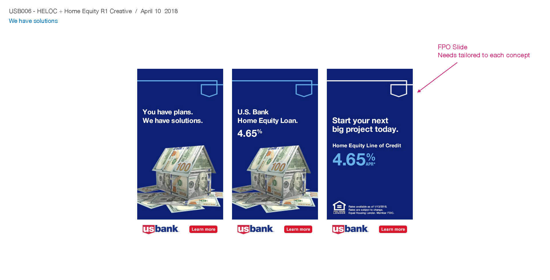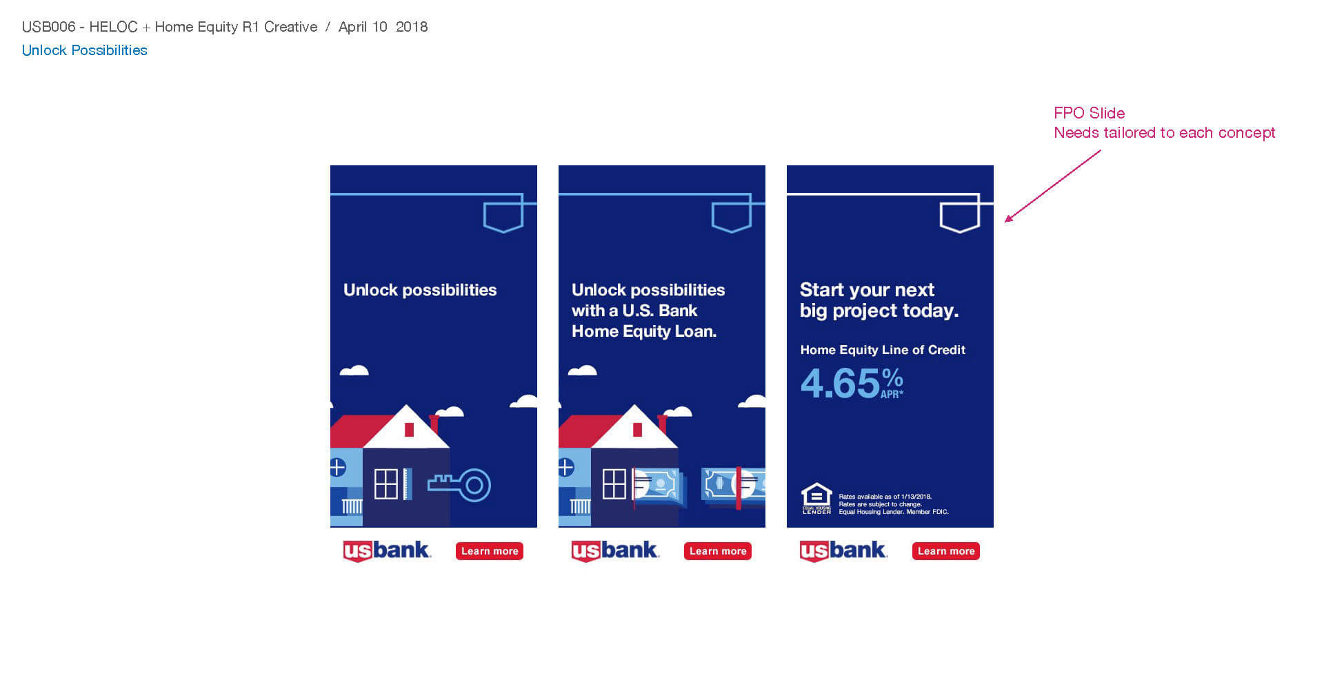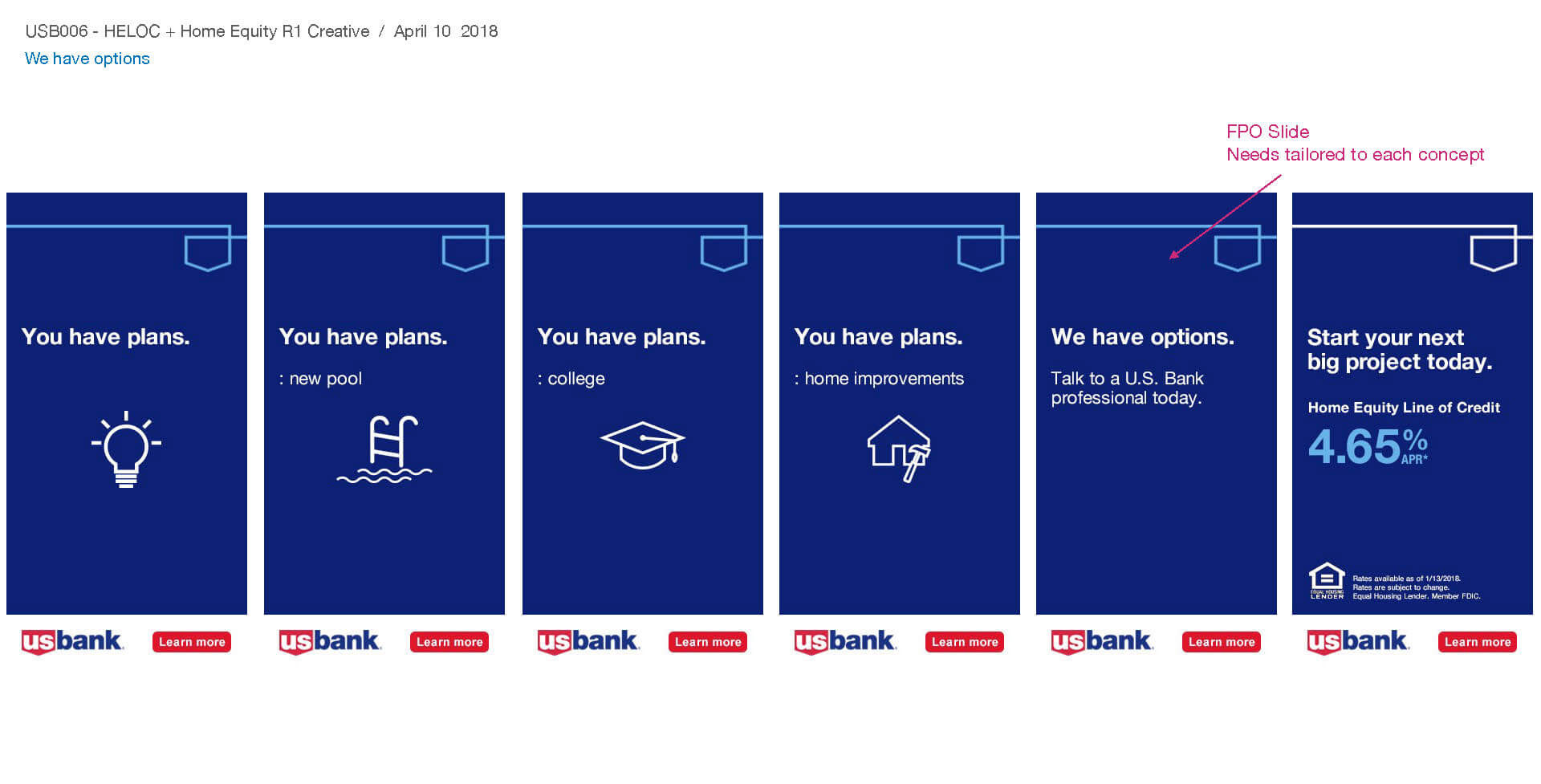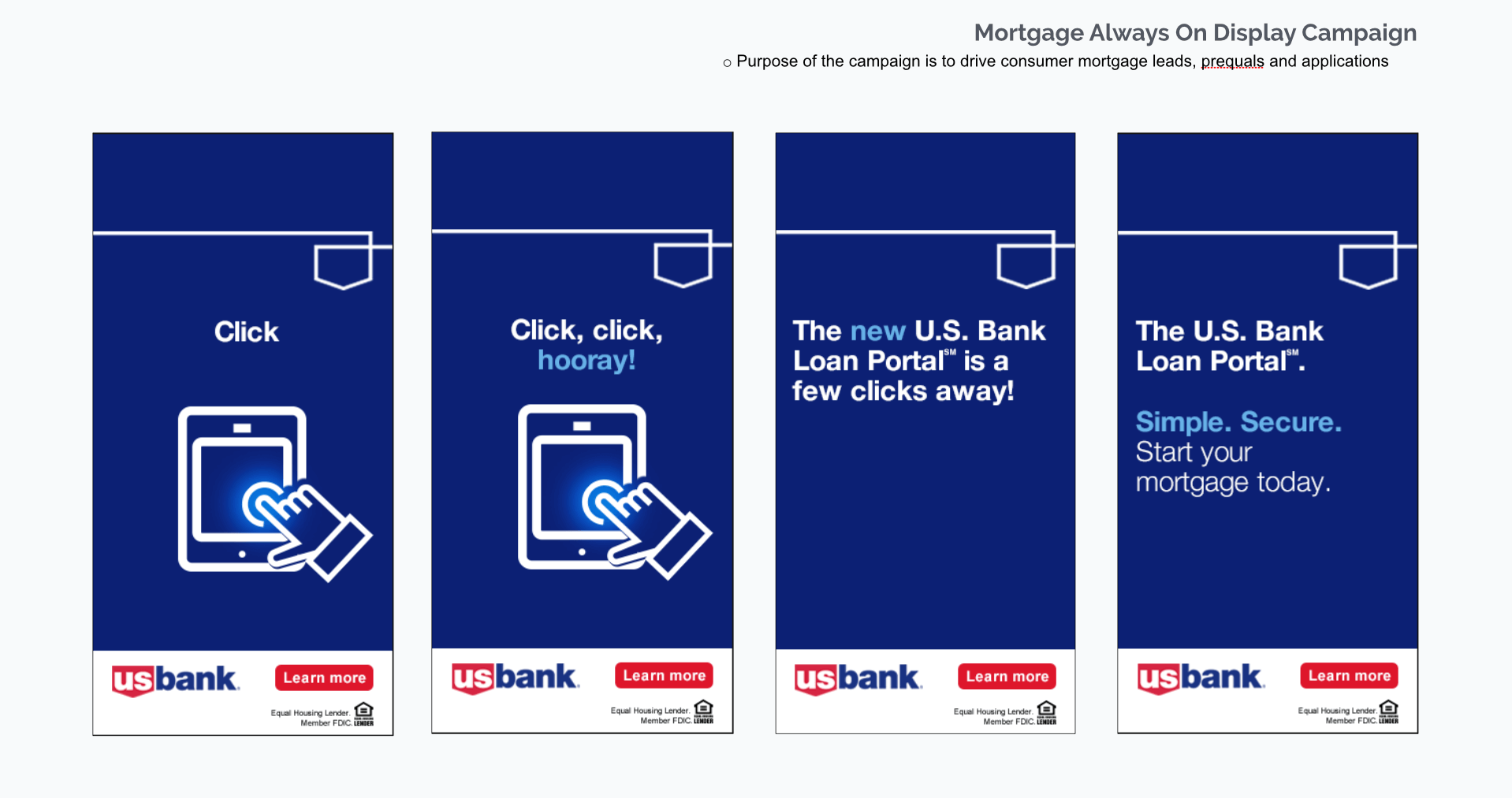 Additional Concepts for other U.S. Bank Digital Display Projects, from Mortgage and HELOC to Loan Portals, Student and Consumer Checking... deliverables always included: concepts / design / production of HTML5 ads ready for trafficking using Google AdWords and/or Double Click.