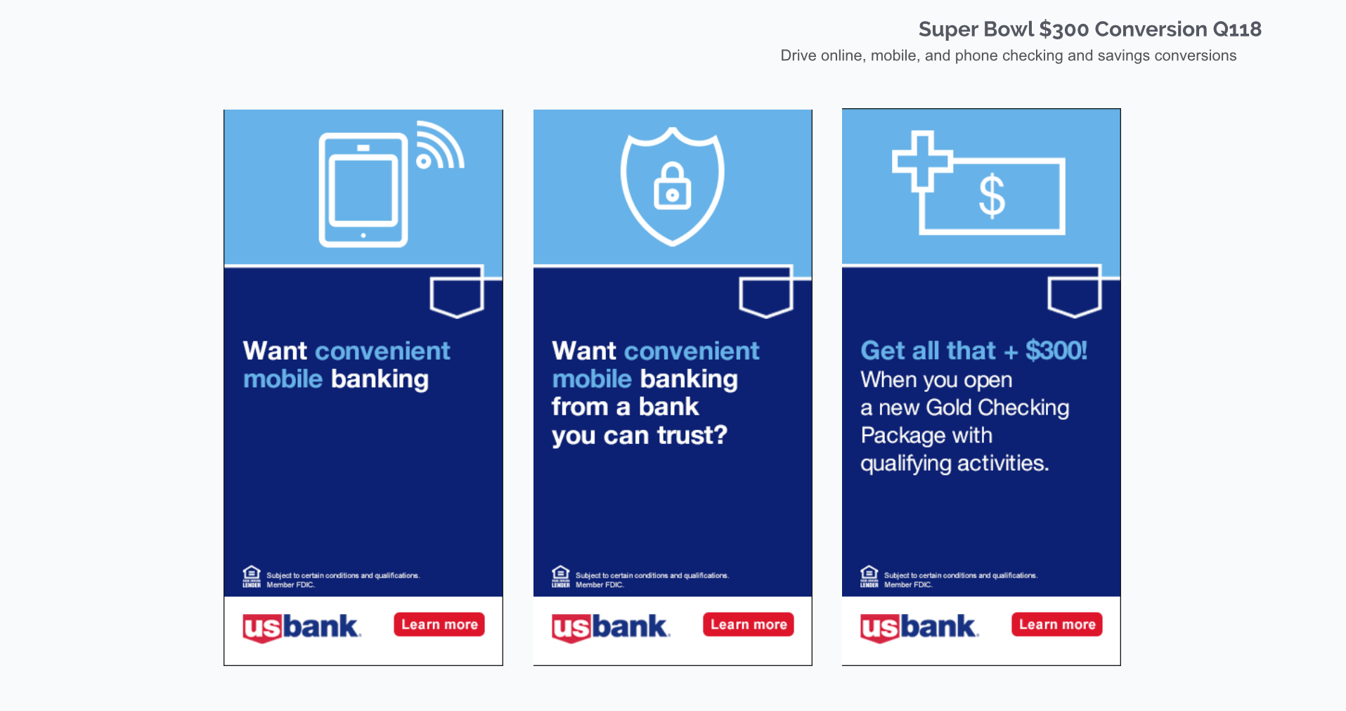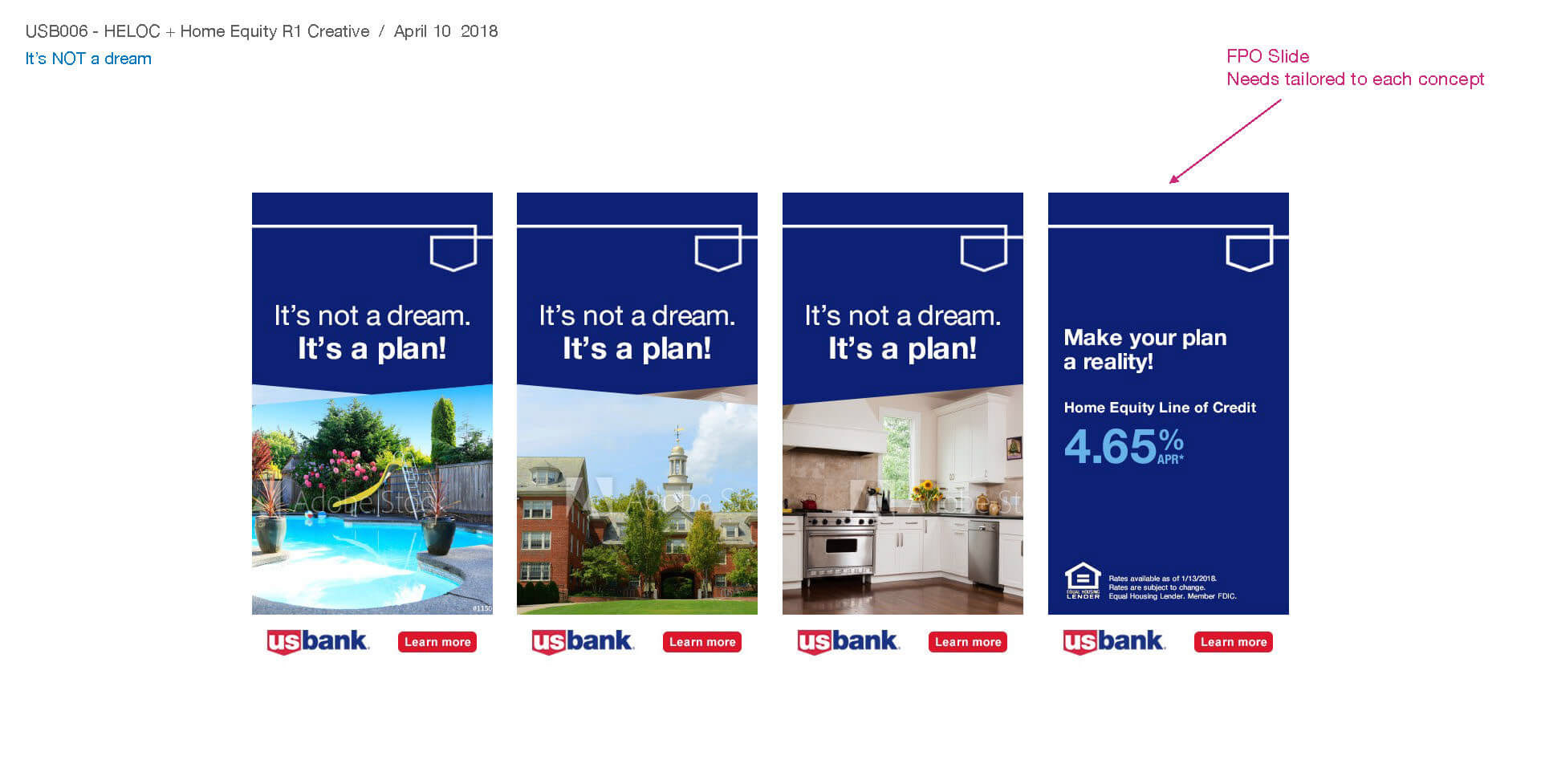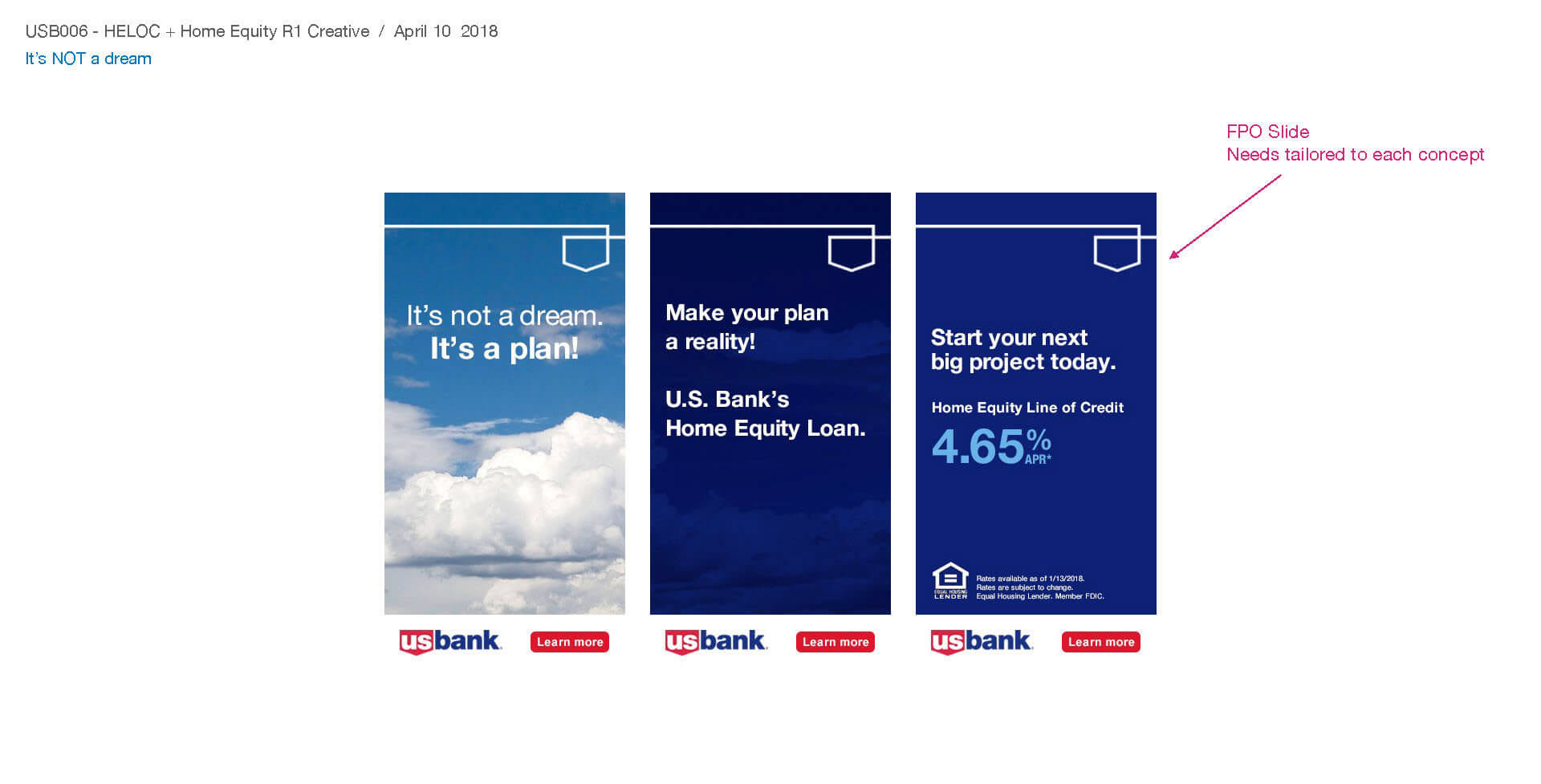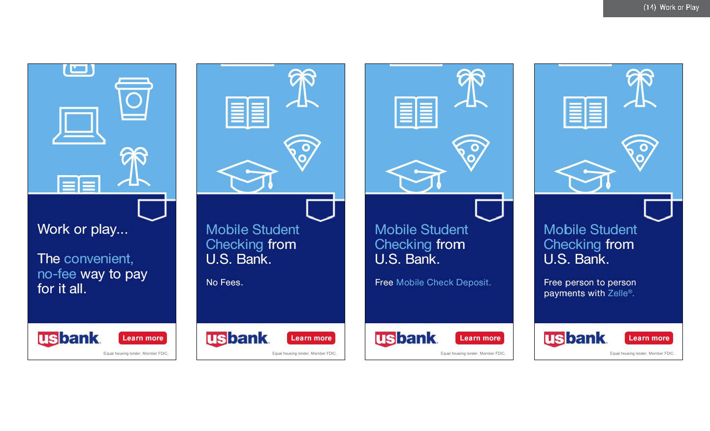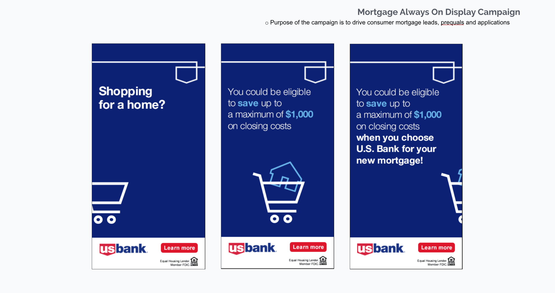 Additional Concepts for other U.S. Bank Digital Display Projects, from Mortgage and HELOC to Loan Portals, Student and Consumer Checking... deliverables always included: concepts / design / production of HTML5 ads ready for trafficking using Google AdWords and/or Double Click.